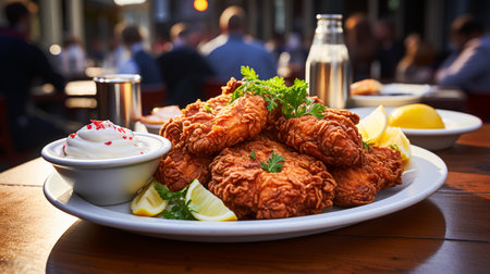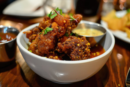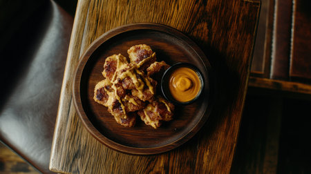 A beautiful arrangement of crispy chicken nuggets served with a rich dipping sauce on a rustic wooden table, perfect for sharing and enjoying comfort food moments.