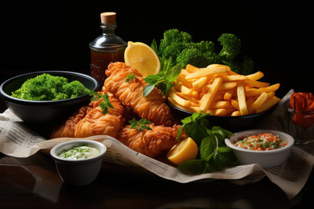 Superior view of fish and chips in a bowl and paper package with copy and lemon sp, generative AI