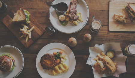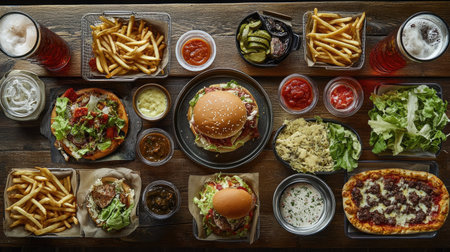 A vibrant spread of diverse fast food items featuring burgers, fries, toppings, and condiments. Perfect for showcasing casual dining experiences and food indulgence.