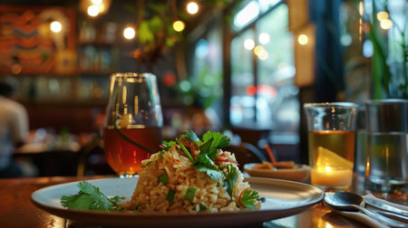 A cozy, dimly lit restaurant setting with a focus on a plate of rice, garnished with fresh cilantro and served with a side of pickled vegetables