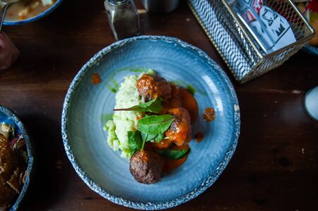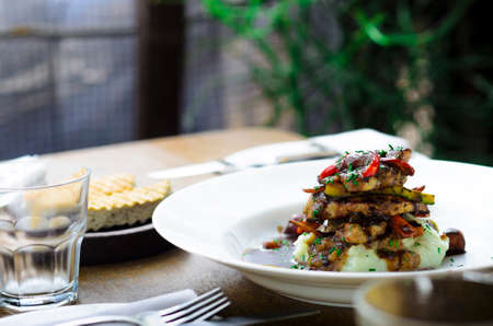 European international fusion cuisine, a beautiful dish on a white plate decorated with herbs and vegetables. a professional chef has prepared a delicious meal. Vegetarian food and meat restaurant dishes. fast food.