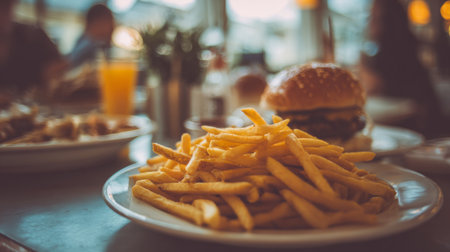 This image showcases a plate of crisp golden fries placed in front of a delicious burger and refreshing drink, capturing the essence of casual dining.