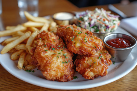 Delicious golden-brown fried fish fillets are served with crispy french fries, creamy coleslaw, tartar sauce and ketchup