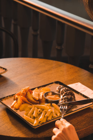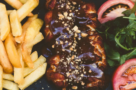 American fast food. A couple of beef and chicken skewers with a delicious peanuts sauce with some fresh salad with tomatoes and crunchy french fries. Delicious meat steaks on a wooden background.