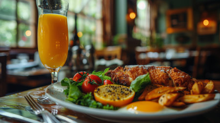 An AI generated illustration of A plate of fried fish and French fries accompanied by a glass of fresh orange juice