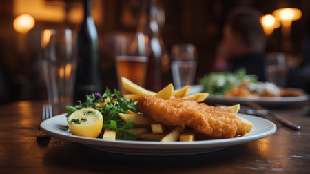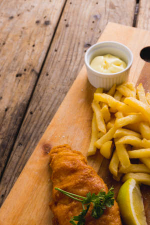 Traditional fish and chips on a wooden table in a restaurant. Selective focus