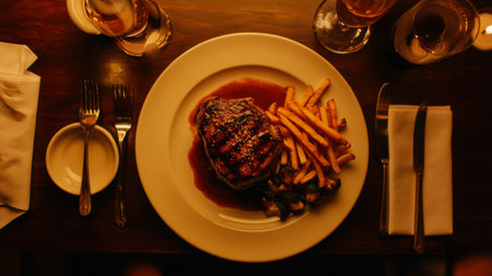 A beautifully arranged plate featuring grilled steak with crispy fries and rich sauce, perfect for culinary enthusiasts and restaurant promotions.