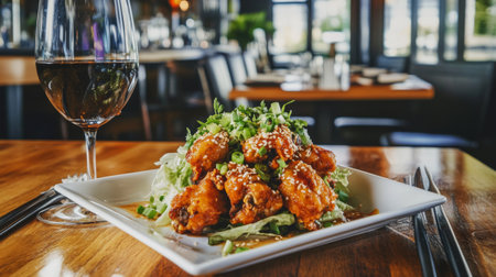 A tempting plate of crispy chicken wings garnished with fresh greens, served alongside a glass of wine in a cozy restaurant setting. Perfect for any meal.