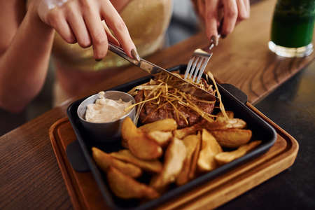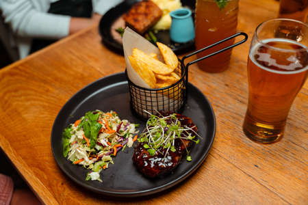 Closeup of grilled pork steak with salad on a plate, frenchfries and salad vegetables