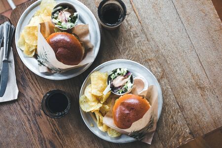 Craft beef burgers with vegetables on a plate with chips and salad on a wooden table.