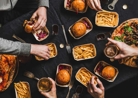 Lockdown family fast food dinner from delivery service. Flat-lay of friends having quarantine home party with delivered burgers, fries, sandwiches, pizza, beer over dark table background, top view