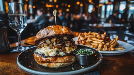 A delicious gourmet burger topped with caramelized onions, served with crispy fries in a vibrant restaurant atmosphere perfect for dining.