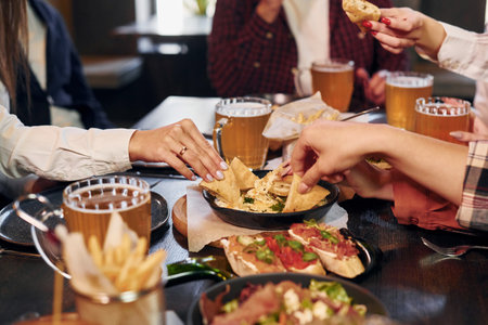 Wellness of the people. Group of young friends sitting together in bar with beer.