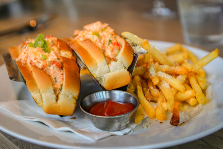 Tasty fresh lobster roll sandwiches with potato french fries on a white plate at a restaurant in Newport Beach, California