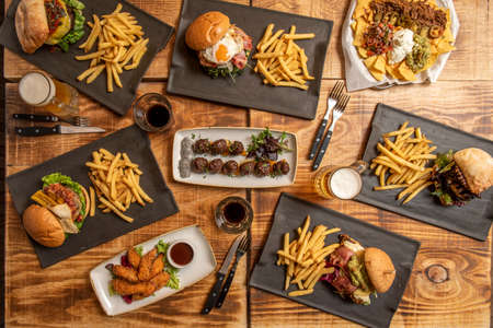 Set of fast food dishes and assorted beef burgers, meatballs with cream cheese, phyto eggs, nachos with guacamole, chicken fingers on wooden table