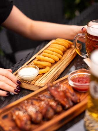 Assorted beer snacks, fast food. Bbq wings and Onion rings with mug of beer.