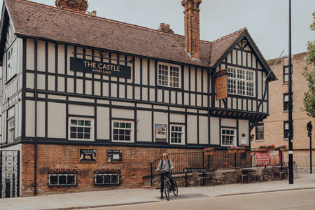Oxford, UK - August 04, 2020: Man on a bike in front of The Castle pub in Oxford, a city in England famous for its prestigious university, established in the 12th century.