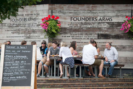 LONDON, ENGLAND - August 11 2017 A motley crowd sits outside the pub, drinks beer, talks with friends. Southbank