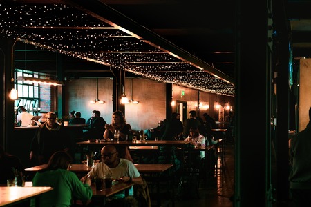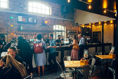 London/UK - July 17, 2019: people enjoying their time inside a pub at Camden Market. Pubs are a social drinking establishment and a prominent part of British culture; selective focus