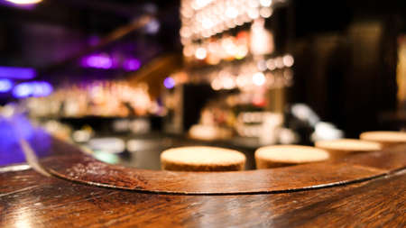 Wooden bar table in front of abstract blurred background of restaurant in the dark