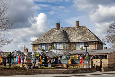 | UK - 2021.04.24: The Kingfisher pub restaurant open on warm Spring day in Chertsey