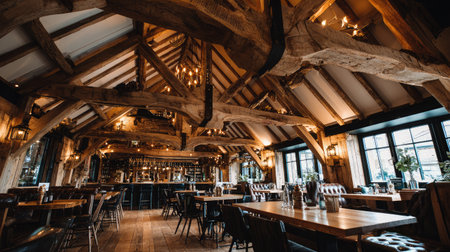 This cozy rustic restaurant interior features wooden beams and elegant chandeliers, creating a warm atmosphere ideal for dining or social events.