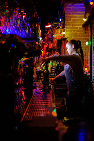 Female bartender prepares a drink while working in a bar.