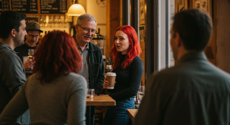 Group of happy multiracial friends resting and talking at bar or pub.