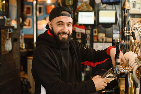 Smiling bearded barman pours beer into a glass. Friendly man working at the bar.