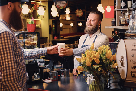 Positive bearded barista male selling coffee to a consumer in a coffee shop.