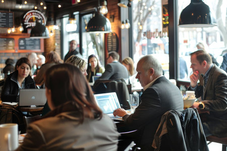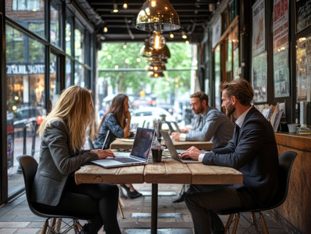 Multiracial business people working connected with technological devices at the bar. Group of three young creative coworkers working with new startup project.