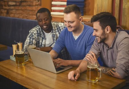 Dating website. Three happy young men drinking beer and using lapop in pub together