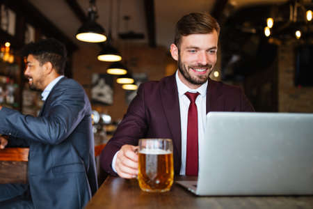 Handsome businessmen are drinking beer, talking and smiling while resting at the pub