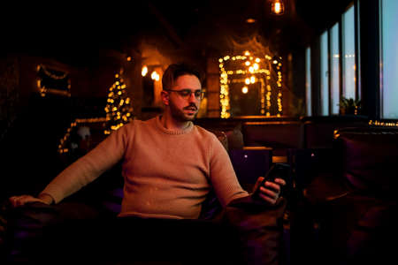 Young businessman texting on a smartphone sitting in a cozy cafe at night.