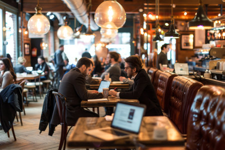 People are eating in a modern cafe. Black monochrome simple interior inside