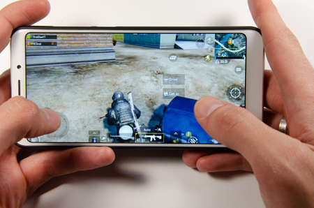 April, 2019. Kramatorsk, Ukraine. The gameplay of the game PUBG G Mobile on a white smartphone in hand