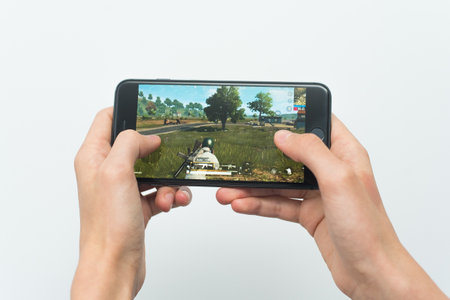 Los Angeles, California, USA - 17 December 2018: Hands holding a smartphone with PUBG FPS game