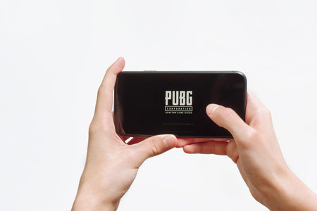 Los Angeles, California, USA - 25 February 2019: Hands holding a smartphone with PUBG Player Unknowns Battlegrounds game on display screen, Illustrative Editorial