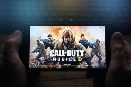 Bishkek, Kyrgyzstan - October 10, 2019: Loading screen. Man playing online game in call of duty mobile on iphone 11