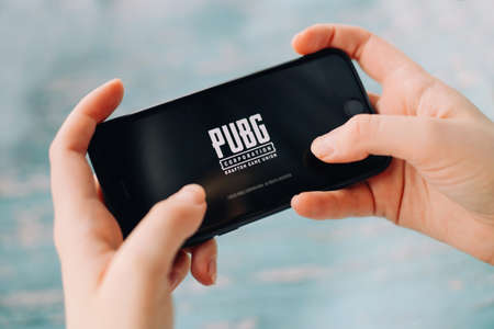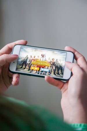 SAINT PETERSBURG, RUSSIA - MAY 27, 2020: Hands holding a smartphone with PUBG FPS game