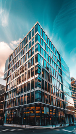A contemporary building exterior is presented from a low-angle perspective, emphasizing its geometric design. The facade features a grid of windows reflecting the surrounding environment. The composition is bathed in natural light, with a visible blue sky. Suitable for illustrating architectural concepts, business imagery, or editorial content.