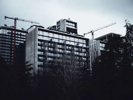 Modern multistory residential buildings under construction. Evening scene with buildings and lifting cranes.