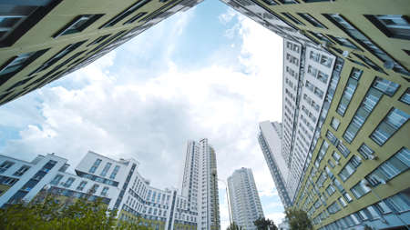 Resident apartment buildings against blue sky. Real estate background