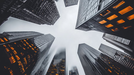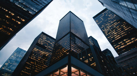 From a low angle perspective, a towering glass skyscraper pierces the overcast sky, its modern facade reflecting the cool tones of dusk.