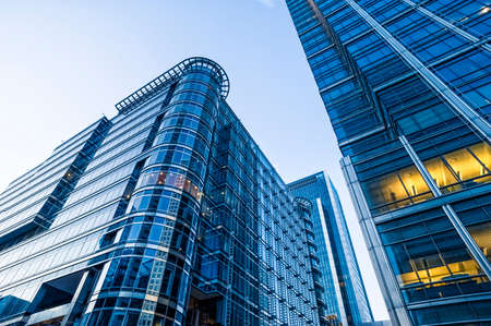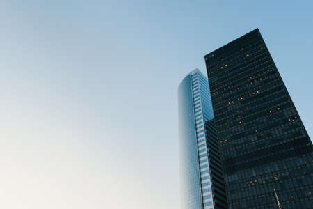 Bottom view of modern skyscrapers in business district against blue sky. Looking up at business buildings in downtown.