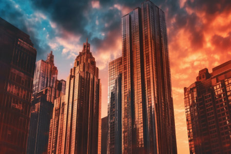 A stunning view of modern skyscrapers silhouetted against a vibrant sunset sky, ideal for real estate and urban development businesses.
