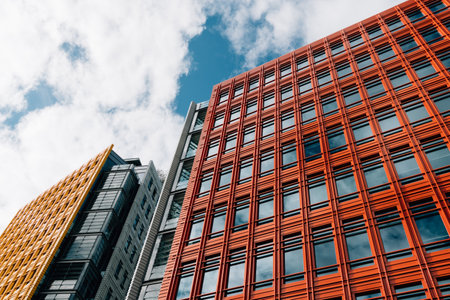 London, UK - August 27, 2023: Low angle view of modern and colorful apartment and office buildings in the City of London. Central Saint Giles in the West End. View against blue sky with white clouds with space for copy.