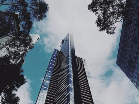 A vertical shot of modern city buildings under a cloudy sky