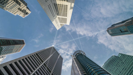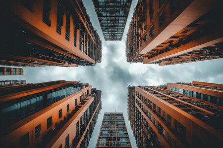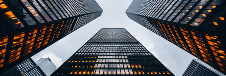 Captivating view of urban skyline featuring modern office buildings reaching into the cloudy sky, showcasing contemporary architecture and city life.