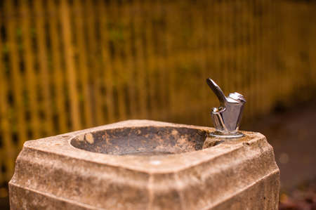 Push button tap, also called self closing faucet on display in a public park, aimed at distributing fresh drinking water, vertically standing on a public fountain